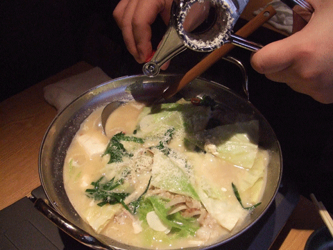 「天然塩チーズ和牛もつ鍋」(1人前1380円)。お客の目の前でチーズを削る。