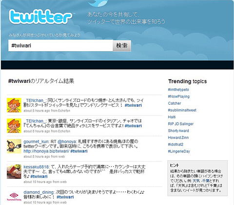 また、「#twiwari」と検索すると、「ぐるなび」経由ではない各店が個々に実施している、「ツイッターを見た人は割り引きます」などの「ツイ割」情報が一覧で出てくる。
