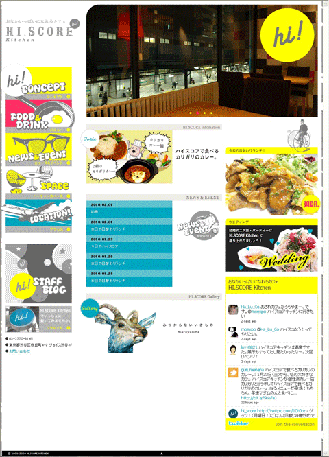 ハイスコアキッチンのホームページ。右下にツイッターのタイムラインを表示。